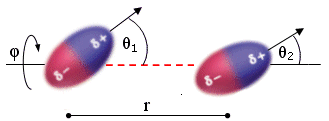 Per due dipoli stazionari (all'interno di un solido) l'energia di Keesom risulta inversamente proporzionale alla terza potenza della distanza r e dipende dall'orientazione reciproca (angoli θ e φ).
