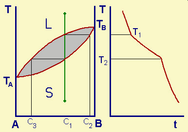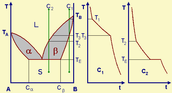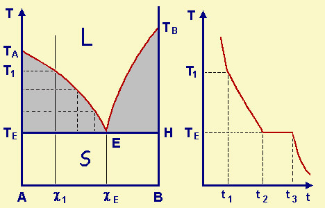 Raffreddando la soluzione di composizione , alla temperatura T = T1 inizia a cristallizzare A puro, al tempo t1; il liquido si impoverisce in A, perciò la sua composizione c si muove verso destra, lungo la curva TA-E. Di conseguenza la T di solidificazione diminuisce.
