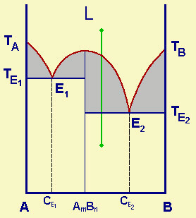 Fig.30.3 Diagramma isobaro di stato di una lega binaria con formazione di composto intermetallico di composizione AmBn. Si può considerare come la giustapposizione di due diagrammi di stato con eutettici E1 ed E2 ed è possibile trattare il sistema globale come quello semplice con un solo eutettico, a seconda della composizione della miscela. Per esempio, se la composizione della miscela si trova tra quella del composto AmBn e quella del secondo eutettico E2, (tratto in verde) si utilizzerà solo la parte a destra del diagramma: si formerà dapprima solo AmBn; quando si raggiungerà la TE2, cristallizzeranno separatamente i due solidi AmBn e B. Il primo sistema è perciò costituito solo dai due componenti A e AmBn; il secondo solo dai due componenti AmBn e B. |