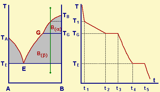 L'analisi termica del processo di raffreddamento per la miscela presa in considerazione, dà il grafico a destra in cui, al tempo t1 la miscela (T = T1) inizia a separare B(a); al tempo t2 raggiunge T = TG, corrispondente al liquido di composizione G: a questo punto inizia la transizione a → b, che termina al tempo t3. Da t3 a t4 si separa B(b); ma a t4, T = TE; siamo all'eutettico: la soluzione rimanente solidifica tutta a T = TE.