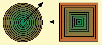 Fig.30.6 Sezioni di cristalli misti zonati. Ogni linea corrisponde alla formazione di cristalli in tempi successivi lungo la direzione della freccia. Poiché il raffreddamento è stato troppo veloce per permettere alla fase solida di mentenersi in condizioni di equilibrio, le zone interne sono più ricche nel componente B che cristallizza prima, le esterne in quello che cristallizza dopo, arrivando addirittura ad A quasi puro. Da notare che, in questo caso, il diagramma di stato non viene seguito, poiché esso presuppone sempre condizioni di equilibrio. |