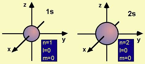 L'orbitale 1s è così rappresentabile come una sfera che contiene il 90% di carica elettronica. Il 2s è simile all'1s ma di dimensioni maggiori. Al crescere di n, numero quantico principale, crescono le dimensioni.
