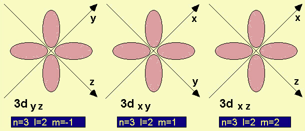 Fig.8.3 Tre orbitali di tipo d, simili tra loro, rispetto alle coordinate cartesiane. Ognuno di questi orbitali d ha due piani nodali: per il dyz, per esempio, sono i due piani xy e xz. |
