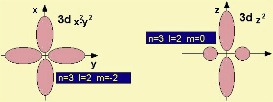 Fig.8.4 Gli altri due orbitali di tipo d rispetto alle coordinate cartesiane. Il primo a sinistra ha 2 piani nodali, perpendicolari a quello del disegno e che comprendono le bisettrici degli assi x y; il secondo una superficie nodale conica con il vertice all'incrocio degli assi cartesiani, dato che la parte di orbitale che giace sul piano xy ha struttura toroidale, con asse di simmetria z. |