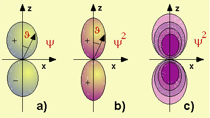 Fig.8.5 Vari tipi di rappresentazione degli orbitali, legati al loro campo di utilizzo. Gli esempi sono relativi a un orbitale pz sul piano xz (l'immagine tridimensionale si ottiene per rotazione attorno all'asse z). a) rappresenta un diagramma polare di ampiezza b) rappresenta un diagramma polare di probabilità (o di densità) c) rappresenta una mappa di probabilità |