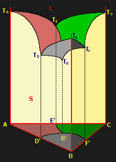 Fig.31.1 Diagramma ternario in cui ogni coppia di componenti presenta un diagramma eutettico. Ognuna delle coppie possibili fra i tre componenti A, B, C, ha un suo diagramma di stato liquido-solido con presenza di punto eutettico. Le Ti rappresentano le singole temperature. La coppia A-B, per esempio, presenta (come le altre coppie) un eutettico D, ed è rappresentata dalla faccia del prisma triangolare su cui giacciono i punti (TA A B TB TD). La parte superiore della faccia rappresenta la fase liquida L, sempre per la coppia A-B. Essendo però presenti tre componenti (all'interno del prisma), il sistema, a seconda dei rapporti A/B/C, ha le sue condizioni di equilibrio liquido-solido sulle tre superfici ternarie (TA TE TG TD, marrone), (TB TF TG TD, grigio), (TC TF TG TE, verde). In particolare, la superficie (TA TE TG TD) dà le condizioni in cui il solido A si separa dal liquido ternario. Le curve generate dalle intersezioni tra due superfici, (TD TG), (TE TG), (TF TG), sono le curve eutettiche ternarie, che rappresentano le condizioni di separazione di due fasi solide dal liquido (le fasi A puro e B puro per la curva TDTG, per esempio). Queste tre curve si incontrano in un punto eutettico ternario, individuato dalla TG, che rappresenta la sola temperatura in cui il liquido può coesistere in equilibrio con le tre fasi solide A, B, C. E' un punto invariante (v = 3 + 2 - 4 = 1) dato che la p è fissata. Sotto TG il liquido non può esistere. |