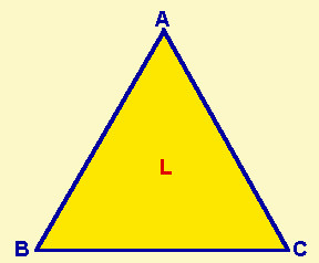 Fig.31.2 Sezione isoterma del diagramma tridimensionale ternario a T> TA, TB, TC, Rappresenta una situazione in cui esiste solo la fase liquida, L, in cui i tre componenti sono completamente miscibili tra loro. |