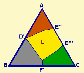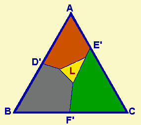 Fig.31.3 Sezione isoterma del diagramma tridimensionale ternario a T > TG. Il triangoloide interno, L, rappresenta la zona di esistenza della fase liquida. A E' D' (colore marrone) identifica la zona di esistenza di A, B D' F' (colore grigio) identifica quella di B, C F' E' (colore verde) identifica quella di C. D', E', F' sono le miscele eutettiche delle coppie AB, AC, BC. |