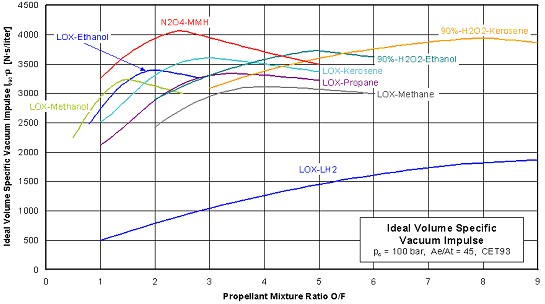 Figura 1.5: L'impulso specifico volumetrico ideale di alcuni bipropellenti in funzione del rapporto di miscela ossidante/combustibile.