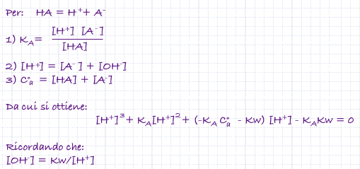Per il calcolo 'esatto' del pH di un qualsiasi acido debole monoprotico è necessario risolvere un'equazione di 3° grado, che si ricava dalla soluzione di un sistema di tre equazioni, basate sull'equilibrio di dissociazione, il bilancio delle cariche e il bilancio delle masse.