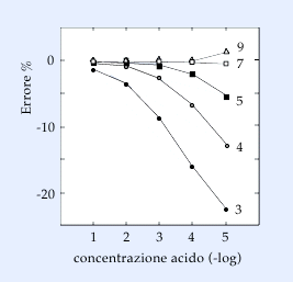 Per comprendere quale sia la risposta da dare, osservate il grafico qui a fianco, in cui viene riportato l'errore %, che si commette nella determinazione del pH usando la 1.4, in funzione della concentrazione dell'acido (in ascisse, in scala logaritmica), per diversi valori di Ka (a fianco di ciascuna curva è indicata la pKa). Come si vede, l'errore aumenta al diminuire della concentrazione e all'aumentare della Ka. L'errore, che è sempre negativo (ovvero si ottengono valori di pH sottostimati), può essere anche notevole, fino a superare il 20%. Già con l'acido acetico (pKa ca. 5), ad una concentrazione intorno a 0.0001 M l'errore è oltre il 2%. Il motivo di questo andamento dell'errore è dovuto al fatto che il grado di dissociazione di un acido (o di una base) aumenta con l'aumentare della diluizione, per cui acquista sempre più importanza la differenza fra concentrazione dell'acido indissociato all'equilibrio e la sua concentrazione analitica. Il divario è tanto più marcato, quanto più l'acido è forte. La deviazione in senso opposto della curva relativa ad una Ka molto bassa (pKa = 9), è invece dovuto al fatto che in questo caso, anche a concentrazioni non eccessivamente basse (10 M) non è più trascurabile il contributo degli ioni H+ che derivano dalla dissociazione dell'acqua. |
