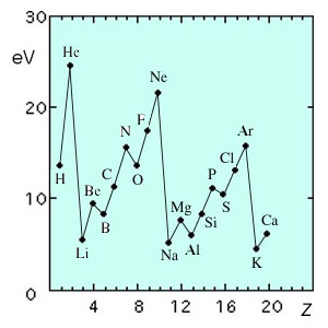 Il potenziale di (prima) ionizzazione è l'energia minima necessaria per allontanare un e- di un atomo a distanza infinita dal suo nucleo. L'unità di misura del P.I. è l'eV (elettronvolt): 1eV = 1.6 x 10-19 joule = 3.82 x 10-20 cal. Per convenzione si considera POSITIVA l'energia fornita (assorbita dal) al sistema. Il P.I. decresce procedendo dall'alto in basso all'interno di un gruppo. Cresce abbastanza regolarmente da sinistra a destra lungo un periodo. Rimane più o meno invariato per gli elementi di transizione.