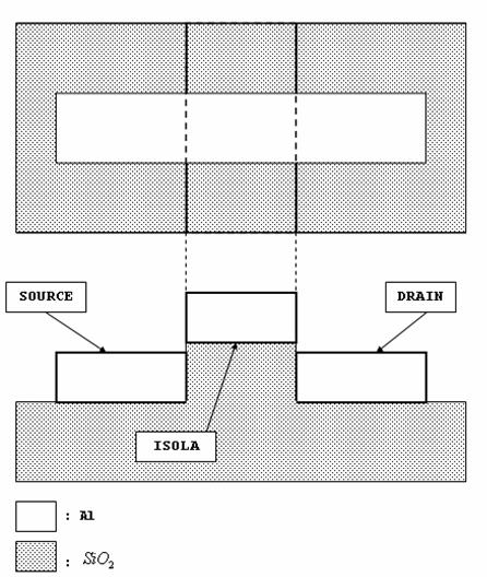 Fig. 1: Rappresentazione schematica della doppia giunzione tunnel SECO realizzata con il processo dry: vista in sezione ed in pianta.