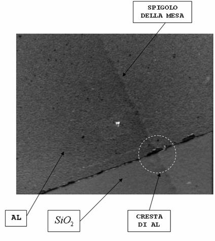 Se il film di Al presenta tali creste proprio all'altezza dello spigolo della mesa, cioè nel punto dove dovrebbe spezzarsi, esse cortocircuitano l'isola con gli elettrodi e sostengono il passaggio di corrente, che non avviene quindi per effetto tunnel come ci si aspetta per il buon funzionamento del dispositivo: la caratteristica del dispositivo sarà in questo caso quella di un resistore (fig. 8).