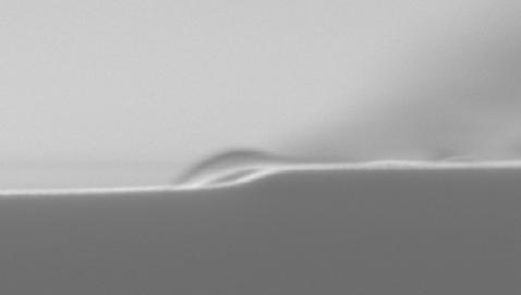In Fig. 1 è mostrata la sezione trasversa di un gradino scavato nell'ossido dello spessore di circa 70nm, che presenta un'accentuata inclinazione delle pareti laterali: essa è imputabile sia al faceting, che alla rideposizione.