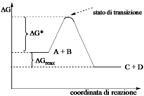 Reazione a un unico stadio. Consideriamo la reazione A+B C+D. Le specie reagenti A e B si incontrano. Nello scontro si ha una riorganizzazione degli atomi nello scheletro della molecola; alcuni legami cominciano ad allungarsi, fino a giungere a completa rottura, mentre altri legami cominciano a formarsi, purchè la direzione di avvicinamento dei reagenti lo consenta (fattori stereoelettronici). Man mano che la reazione procede (spostamento a destra lungo l'asse x) tutto il sistema tende a destabilizzarsi (aumento di energia) fino a raggiungere un punto di instabilità massimo, definito stato di transizione. Continuando la reazione, il sistema si stabilizza fino a raggiungere la completa formazione dei prodotti di reazione C e D.