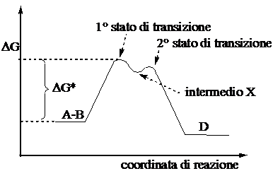 Reazione a due stadi. Consideriamo la reazione A-B X; X + C D. X è un intermedio reattivo, con energia molto maggiore di quella dei reagenti: la formazione di X è endotermica. Una volta formato, X può riformare il reagente A-B o, reagendo con C, formare il prodotto D. La reazione A-B D passa attraverso due stati di transizione; è facile osservare che il raggiungimento del primo stato di transizione richiede una energia di attivazione molto maggiore, per cui è accettabile l'approssimazione che la velocità dell'intero processo dipende dalla velocità del primo stadio.