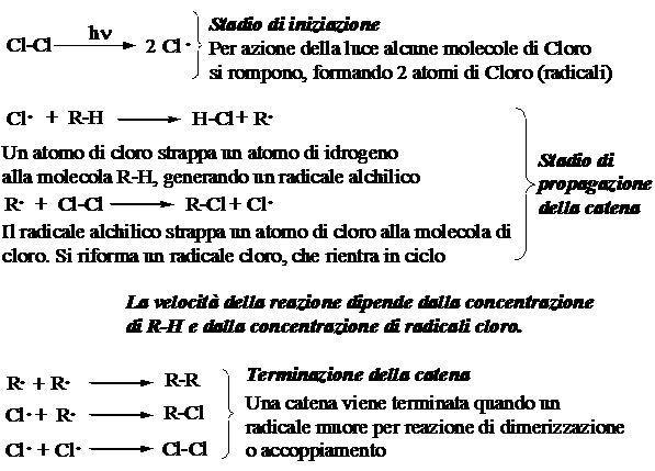 Il meccanismo (la strada attraverso cui) il cloro sostituisce l'idrogeno coinvolge la formazione di radicali liberi. Si tratta quindi di una reazione di sostituzione radicalica. Si tratta di una tipica reazione radicalica a catena, che prevede le seguenti fasi: