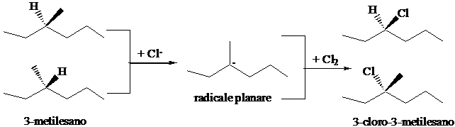 I radicali sono planari. L'attacco può avvenire da una o dall'altra parte, indifferentemente, portando a entrambi le possibili configurazioni sull'atomo di carbonio, quindi a entrambi gli stereoisomeri.