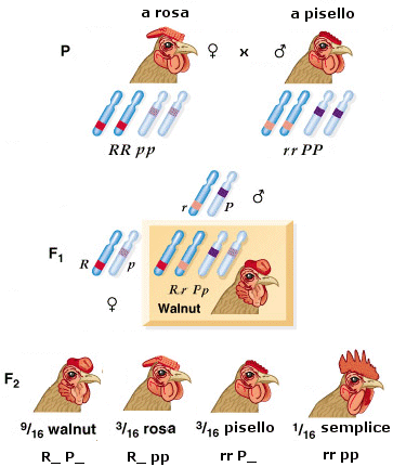 La presenza del gene dominante R_ e del gene dominante P_ genera la cresta a noce |