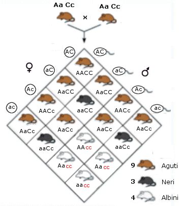 Il genotipo omozigote recessivo cc produce albinismo ed è epistatico verso AA, Aa e aa (ipostatici) mascherandone gli effetti. Se incrociamo due diibridi grigi (aguti) AaCc otteniamo infatti