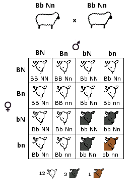L'allele B produce il colore bianco (assenza di colore) ed è epistatico verso NN, Nn e nn (ipostatici) mascherandone gli effetti. Il colore nero (genotipi NN ed Nn) e marrone (genotipo nn) si possono manifestare solo in assenza dell'allele B e quindi quando il gene epistatico è in forma omozigote recessiva (bb), Se incrociamo due diibridi bianchi BbNn otteniamo infatti