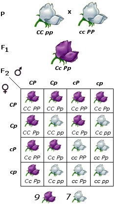 Nel pisello odoroso la contemporanea presenza dell'allele C e P produce fiori violetti, mentre i genotipi C_pp, ccP_, e ccpp sono bianchi.