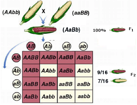 Si ipotizza che il pigmento venga sintetizzato da un unico precursore grazie alla presenza di un enzima A o un enzima B o entrambi indifferentemente. La cariosside risulterà pertanto colorata se i due geni A e B che codificano per i rispettivi enzimi, si presenteranno, separatamente o contemporaneamente in forma dominante (A_bb, aaB_, A_B_). La cariosside sarà priva di colore solo se i due geni si presenteranno entrambi in forma recessiva (aabb).