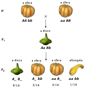 Il gene dominante A_ ed il gene dominante B_, presenti insieme, determinano la forma a disco. Il gene recessivo aa ed il gene recessivo bb, presenti insieme determinano la forma allungata.