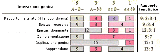 Sono stati classificati i seguenti tipi di interazioni tra geni: epistasi, soppressione, complementazione e duplicazione genica.