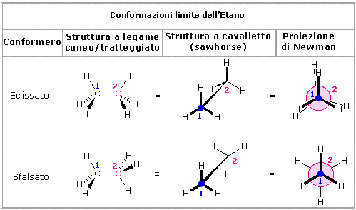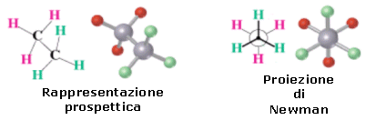 La figura seguente mostra la molecola dell'etano (C2H6) osservata nello spazio secondo due diverse proiezioni: prospettiche o a cavalletto (saw-horse) e frontali o di Newman.