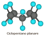 Il ciclopentano in conformazione planare avrebbe angoli interni di 108°, quindi molto vicini all'angolo tetraedrico. In tali condizioni sarebbe praticamente assente la tensione angolare, ma la conformazione risulterebbe oltremodo instabile a causa della tensione torsionale prodotta dalla disposizione completamente eclissata dei legami C-H adiacenti.