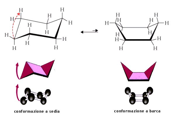 Le due conformazioni in reciproco equilibrio che rappresentano il cicloesano sono le seguenti: