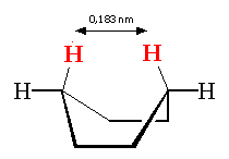 Inoltre in tale conformazione è presente anche una tensione sterica dovuta agli idrogeni "ad asta di bandiera" (flagpole) che si trovano ad una distanza di 0,183 nm, considerevolmente inferiore della somma dei loro raggi di Van der Waals (0.250 nm)