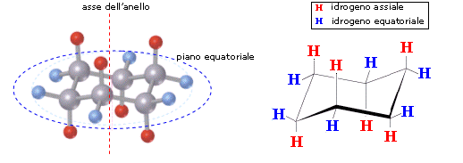 Nonostante il cicloesano non sia piano è possibile individuare un asse dell'anello ed un piano perpendicolare ad esso detto piano equatoriale. I dodici atomi di H occupano quindi alternativamente posizioni assiali (verticali) ed equatoriali (orizzontali).