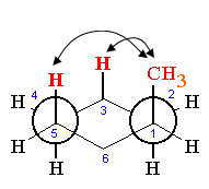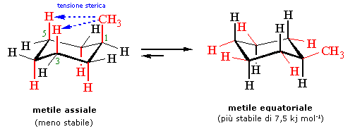 Si può dire che un dato atomo o gruppo ha più spazio disponibile nelle posizioni equatoriali che in quelle assiali. Quindi, tra le configurazioni a sedia, sono più stabili quelle con i gruppi più voluminosi nelle posizioni equatoriali. Nella miscela di equilibrio la conformazione di metilcicloesano con il metile equatoriale è predominante (~95%). La tensione sterica che si manifesta tra un gruppo chimico in posizione assiale e l'idrogeno assiale posto sullo stesso lato del piano equatoriale è la conseguenza di una repulsione di Van der Waals nota come interazione 1,3 diassiale. Si noti infatti che se il gruppo è legato al carbonio in C1 l'interazione interessa l'idrogeno legato al carbonio in C3 (ma anche, come diremo, l'idrogeno legato al carbonio in C5 che risulta perfettamente equivalente al C3)