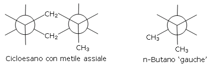 La conformazione 'gauche' del n-butano presenta, rispetto alla conformazione 'anti' una tensione sterica di 3.8 kJ mol-1. Come si può osservare nell'immagine successiva il cicloesano con metile assiale presenta due 'interazioni gauche' ( tra gli atomi di carbonio C1/C3 e tra gli atomi C1/C5) e pertanto possiede una tensione sterica di 7.6 kJ mol-1.