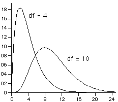 I valori di si distribuiscono dunque in funzione del numero dei gradi di libertà. Si vedano ad esempio le seguenti due curve che rappresentano la distribuzione di frequenza di per 4 e 10 gradi di libertà (in ascissa i valori di ed in ordinata la probabilità che assuma quel particolare valore).
