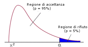 Per valutare dunque il valore calcolato di dobbiamo confrontarlo con i valori che esso può assumere, dato un certo numero di gradi di libertà. Presa dunque in considerazione la curva di relativa al numero di gradi di libertà che stiamo considerando, possiamo verificare che il valore di calcolato non cada nella parte finale della curva (coda) dove sono presenti valori troppo elevati. In genere si divide la curva in due regioni: quella a sinistra (regione di accettanza) con una probabilità del 95% che cada al suo interno e quella a destra (regione di rifiuto) con una probabilità del 5% che cada al suo interno.