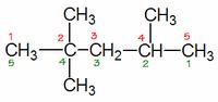 Esempio: due-due-quattro trimetil pentano. (Due (2) tri-metile sul secondo (2) posto, un tri-metile sul quarto (4) = due due quattro tri-metil. 5 Atomi di carbonio = pentano.)