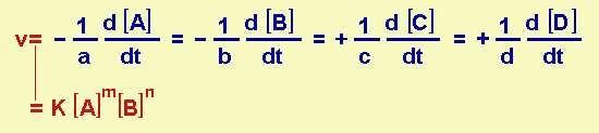 esprimeremo la velocità come variazione nel tempo di uno qualsiasi dei componenti della reazione (sia uno dei reagenti sia uno dei prodotti); la velocità, determinata sperimentalmente, è proporzionale, secondo la costante di velocità 'specifica' K (corrispondente alla velocità della reazione per concentrazioni unitarie: solo in quel caso, infatti, v=K), al prodotto della concentrazione di A elevata alla m per la concentrazione di B elevata alla n.