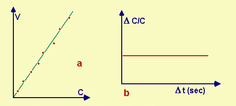 Fig.20.2 Grafici V/C e ΔC/C contro il tempo, per una reazione del I° ordine. a) i punti rossi rappresentano dati ottenuti sperimentalmente, misurando la velocità a concentrazioni diverse di X; la K è data dalla pendenza della retta che si ottiene ottimizzando (generalmente col metodo dei minimi quadrati) la retta individuata dai punti sperimentali; i punti non giacciono tutti esattamente sulla retta dato che sono soggetti a errori sperimentali. b) C rappresenta la concentrazione attuale ed è perciò variabile nel tempo; ma in questo caso l'andamento del grafico ΔC/C contro il tempo è lineare e costante. |