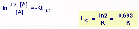 (ln = logaritmo naturale) e se in questa poniamo [A] = 1/2 [A]0, (se vogliamo cioè che la concentrazione sia la metà dell'iniziale, come definito per il tempo di dimezzamento), e dato che t0 = 0 (inizio della reazione), avremo:
