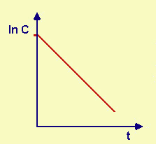 Fig.20.3 Grafico ln C contro t per una reazione del I° ordine. E' possibile capire se una reazione è del I° ordine calcolando i logaritmi delle concentrazioni misurate a tempi definiti e riportando in diagramma le coppie di valori. Se i punti stanno su una retta, allora la reazione è del I° ordine, la K è l'inverso della pendenza della retta e la concentrazione iniziale è calcolabile dall'intercetta sull'asse delle ordinate. |