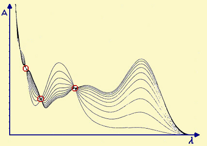 Fig.20.5 Esempio di sequenza di spettri di assorbimento sovrapposti relativi ad una soluzione in cui avviene una reazione del II° ordine (in particolare l'idrolisi dell'acido 2-idrossi-5-nitrobenzensolfonico). I circoletti in rosso evidenziano i cosiddetti 'punti isosbestici', che corrispondono a lunghezze d'onda in cui i 2 componenti A e B della reazione A → B hanno un coefficiente di assorbimento molare ε (epsilon) uguale. Questo è valido perciò solo se la reazione è del tipo A → B e solo per le l in cui le ε di assorbimento di A e B sono eguali. Il vantaggio della presenza di questi punti è che permette di evidenziare l'assenza di reazioni parallele o consecutive |