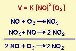La reazione globale di formazione del diossido di azoto da monossido e ossigeno ha, come si vede dalla definizione della velocità v, in rosso, ordine di reazione 3. La reazione in effetti ha un meccanismo in due stadi: 1) stadio di formazione di una molecola di triossido da una di monossido e una di ossigeno, con molecolarità 2 2) stadio di formazione di due molecole di diossido da una di triossido e una di monossido, con molecolarità 2 |