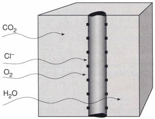 In condizioni teoriche effettivamente il cls protegge il ferro ma in realtà capita che il copriferro è fessurato. Le fessure rappresentano dei cammini preferenziali per sostanze aggressive esterne che vanno ad attaccare il film passivante innescando la corrosione: anidride carbonica e cloruri. Ma il processo corrosivo avviene solamente se sono presenti anche ossigeno e acqua. Quindi, per la corrosione c'è bisogno di questi 4 elementi.