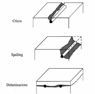 cricche, delaminazione, spalling (saltano via gli spigoli).