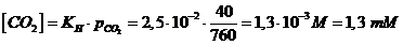 Applichiamo la legge di Henry per calcolare la concentrazione di CO2 nel sangue quando la sua pressione parziale è pari a 40 mm Hg (= 40/ 760 atm)