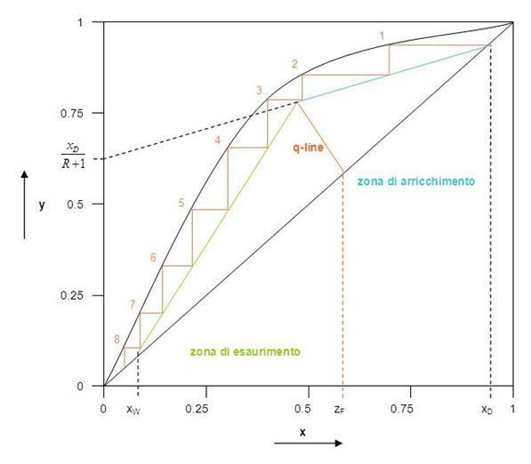 Una nota può essere che la retta di lavoro inferiore si ricava per via grafica, sapendo che passa per il punto di intersezione della linea q con la retta di lavoro superiore, e per il punto sulla bisettrice di ascissa xW.